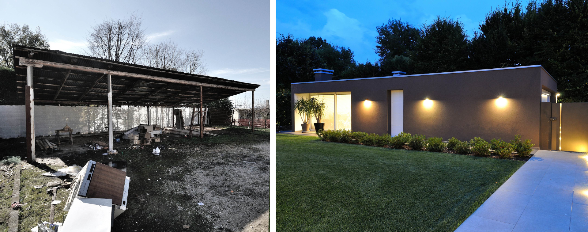 Trasformazione di una vecchia tettoia con terreno incolto in giardino con area coperta