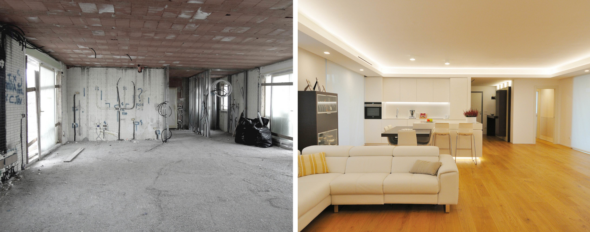 Riqualificazione delle componenti murarie e rifacimento completo degli interni, particolare salone con angolo cucina